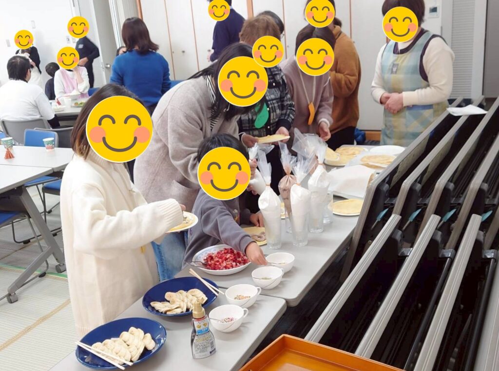 オードブルに婦人部さんが作ってくれたおにぎりやスープ、サラダをいただいた後は、クレープづくりをしました。